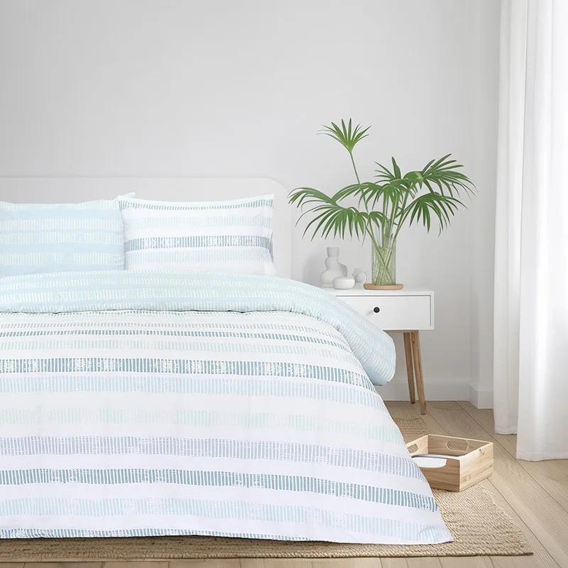 Σετ σεντόνια υπέρδιπλα σε σιελ χρώμα με ριγέ σχέδιο, κατασκευασμένα από 100% βαμβάκι 144 κλωστών. Η φυσική τους σύνθεση προσφέρει απαλή αίσθηση και ανθεκτικότητα στην καθημερινή χρήση. Συνδυάστε με το υπόλοιπο σετ για ένα ολοκληρωμένο αποτέλεσμα.